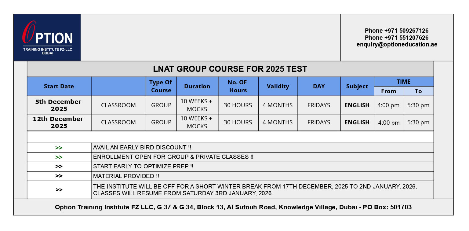 Option Training institute, Knowledge Village, Dubai, gives you exhaustive practice on MCQs and on all the possible essay prompt types so as to train you to get the required score. Training for the LNAT at Option is available in private classes as well as in group classes since our objective is principally to cater to different client preferences and in the process to provide each student a rewarding experience and very effective training.