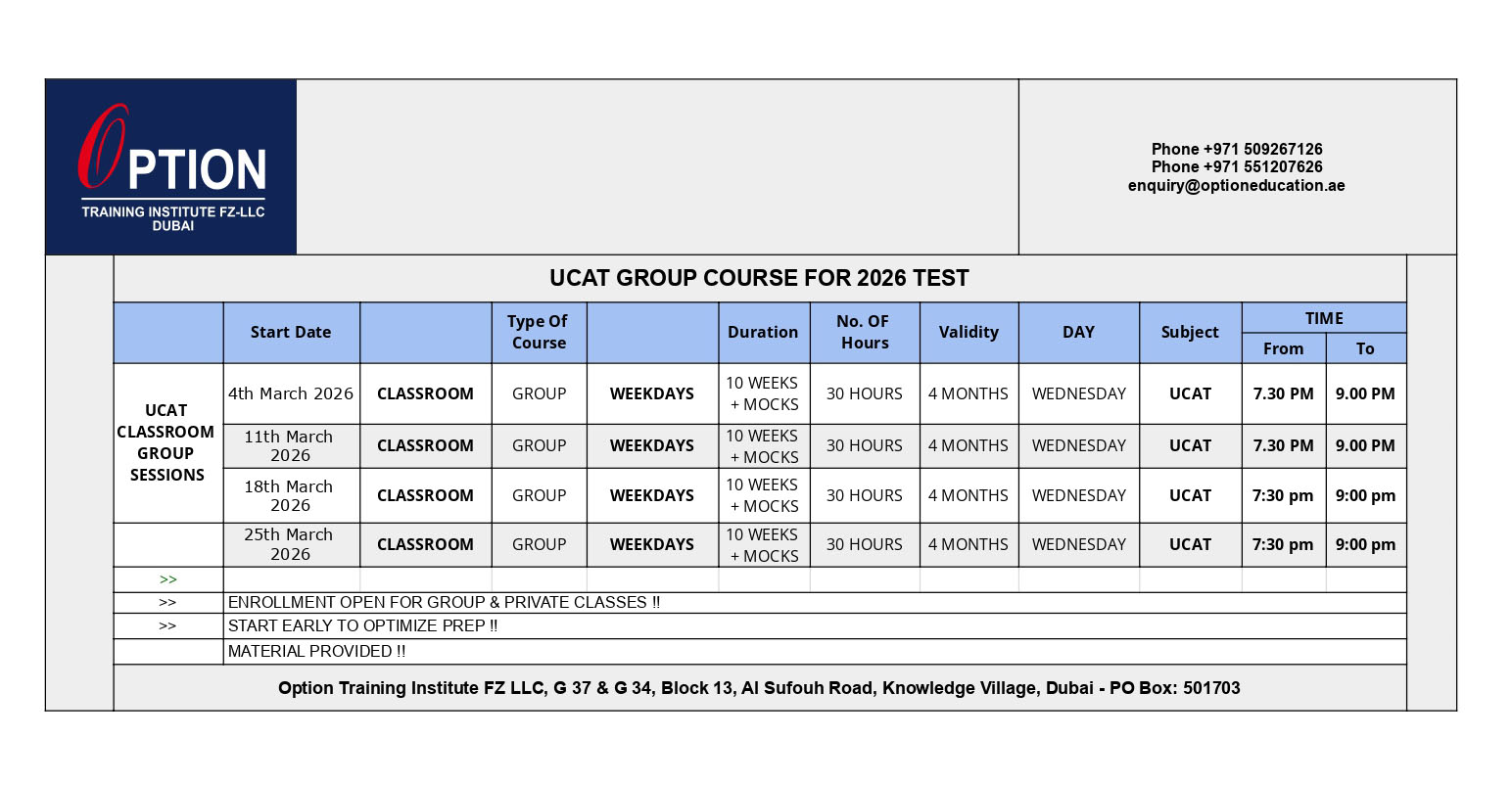 At Option Training Institute, Knowledge Village, Dubai, we provide result oriented, strategy based UCAT test preparation courses – one -on- one and group. By using progressive training methods to maintain the efficiency of the training and to work on the individual student’s weak areas, Option undoubtedly provides students with the finest training in a conducive class environment thereby enabling students to achieve optimum results.
