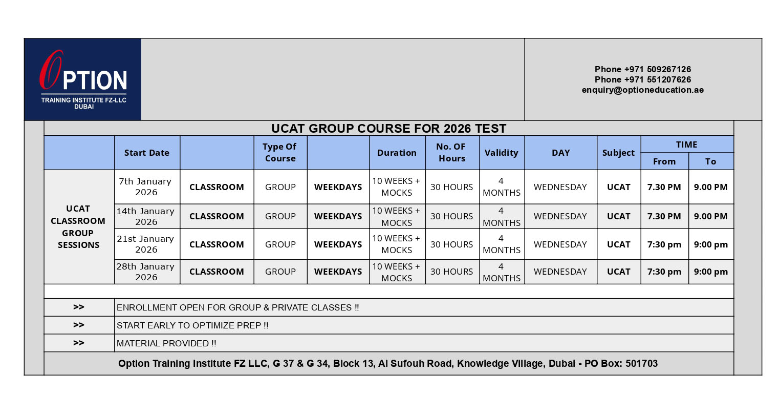 At Option Training Institute, Knowledge Village, Dubai, we provide result oriented, strategy based UCAT test preparation courses – one -on- one and group. By using progressive training methods to maintain the efficiency of the training and to work on the individual student’s weak areas, Option undoubtedly provides students with the finest training in a conducive class environment thereby enabling students to achieve optimum results.